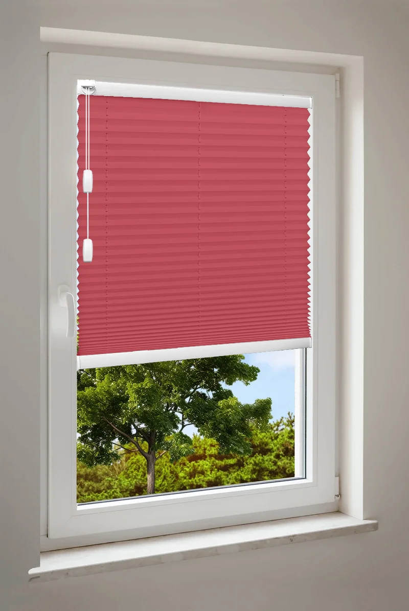 Maßgefertigtes Cosiflor® F1 Plissee in stilvollen roten Stoffvarianten – ideal für eine warme und ausdrucksstarke Raumgestaltung