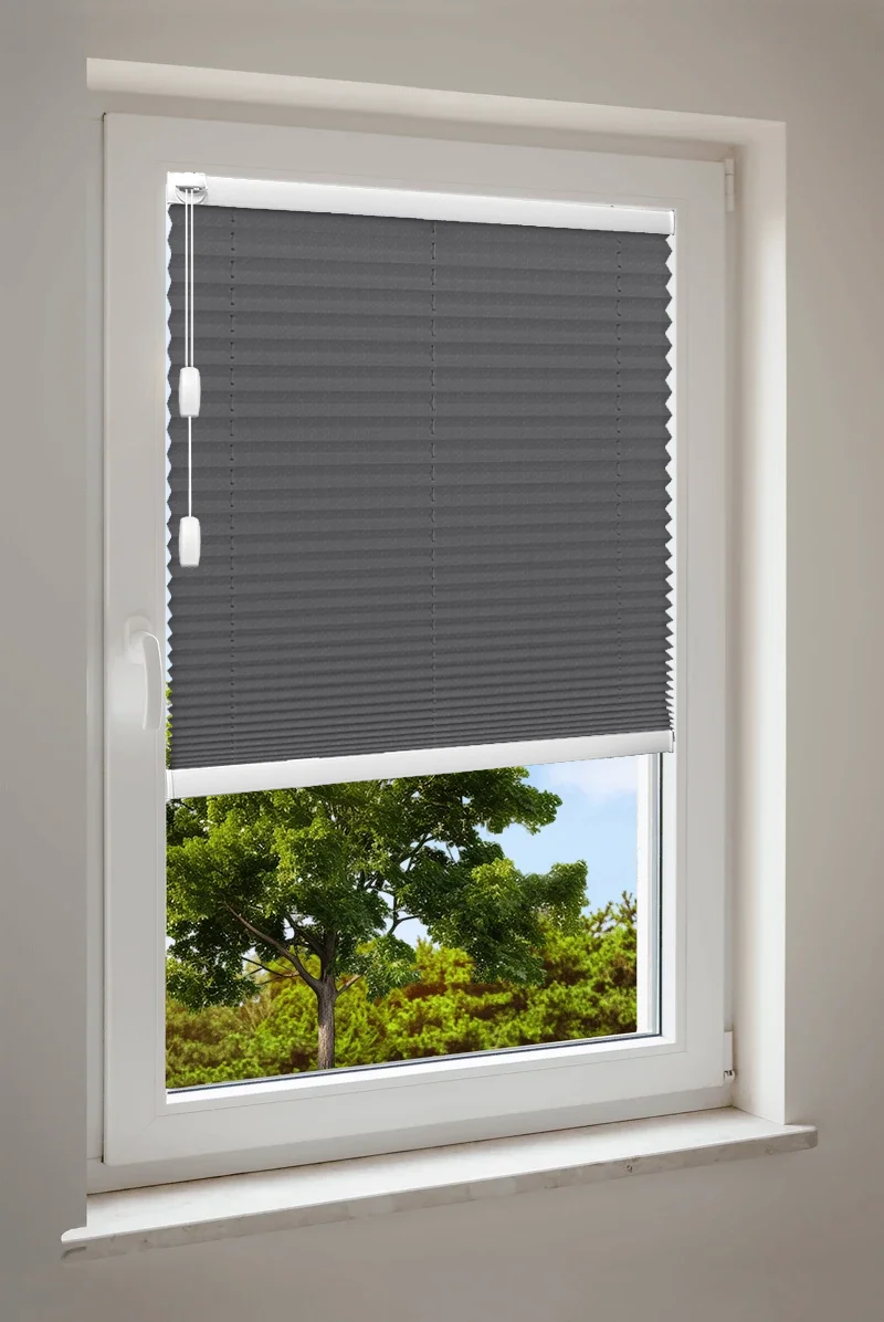 Maßgefertigtes Cosiflor® F1 Plissee in eleganten schwarzen Stoffvarianten – ideal für eine moderne und ausdrucksstarke Raumgestaltung